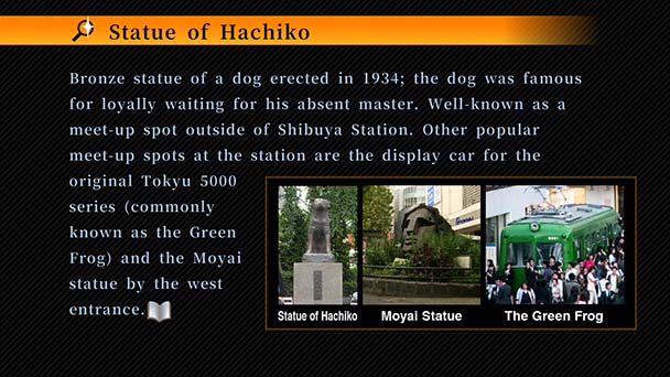 T-G: For those, like me, who appreciate verisimilitude, how many identifiable elements of Shibuya are in the game? Obviously, the crossing is depicted by what about Hachikō, Ichi-Maru-kyu, or the Cerulean Tower?