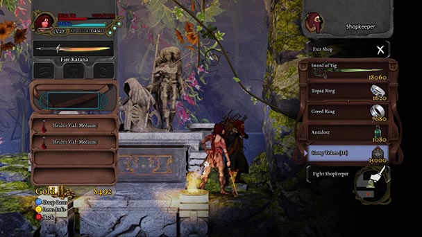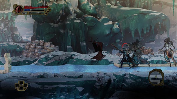 Following a fleeting chat with the village’s requisite armorer and sundry seller, Katrien begins her journey into the Abyss, encountering a myriad of eccentric enemies and environmental hazards like jutting spikes and fire spouting flora. Beyond the availability of a mini-map for navigation, the agile adventurer will later have the ability to pursue the sorcerer down three different routes- with alternative paths trading a shorter course for an increased level of difficulty. Regardless of the paths Katrien chooses, forks in the downward path signal changes in the challenge level, giving gamers the select their level of adversity.