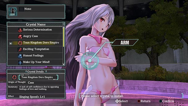 Character development is also delivered through Genometrics, a mechanic which briefly pauses the role-playing proceedings to extend visual novel like sequences. Here, players plump their cohort’s psyche, alleviating worries through branching dialog trees, all in an effort to increase the power of their Song Magic. In execution, it’s a pretty ingenious way to meld character augmentation and exposition, and feels especially interesting when gamed dive into the Soulspace of others, tweaking their personalities to fit a particular play style. Meanwhile, item acquisition is handled via a crafting system which recalls the alchemy mechanic of Gust’s Atelier games. Combat escalation is managed during Purification episodes, where player and heroine change into their swimsuits, and the proper banter allows players to place a power-boosting crystal into one of five different corporal locations. If the gaming industry produces a “metaphor the year” category, Ar nosurge is an absolute shoe-in.