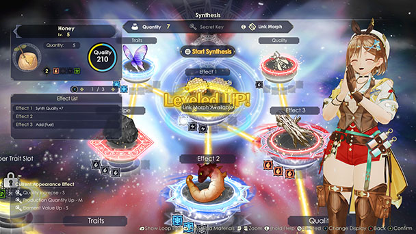 Pleasingly, alchemy scales in complexity. As such, you can analyze every ingredient that goes into your recipe or simply automatically add materials for some basic synthesis. Should you choose to micro-manage your mix, you’ll begin a formula by dropping a designated ingredient in the main branch of the synthesis screen. To improve the quality, endow traits, or elicit effects, you’ll drop in additional items in interconnected side branches. Experimentation with materials that have super traits and recipe morphs inject a bit of variety, but since Ryza is an accomplished alchemist, there are no skill-based mechanics to be found. I would have liked to have seen a basic timing system influence the quality of your craft.