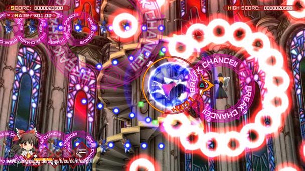 Initially, you’ll tackle Azure Reflections with just Reimu, Touhou’s traditional lead, an optimistic shrine maiden with gohei perpetually in-hand. Achievement unlocked the aforementioned magician and fairy. Expectedly, each heroine fights distinctly, bringing their own types of shooting and skills to the confrontation against diminutive witches, books, bats, as well as the obligatory end-of-level bosses.