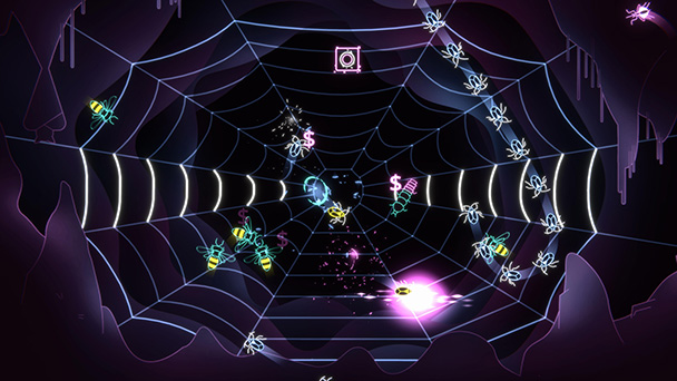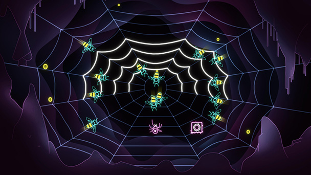 Although the challenge level begins meekly with just a few, slow-moving enemies, it ramps up progressively. Not only do more opponents dot the playfield, but strands of the web temporarily grow solid, hindering your movement. As such, your field of vision will inevitably narrow, as you concentrate on your immediate vicinity.