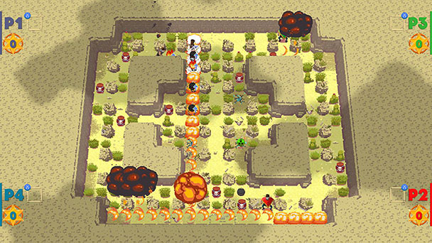 Delve into the title’s Adventure mode, and you’ll guide McMean through a variety of western-themed milieus, with procedurally-generated stages made up of interconnected single-screen maps. Like Bomberman, your primary method of payback is an inexhaustible supply of explosives which send a streak of searing flame across empty spaces on the horizonal and vertical axes. And like Konami’s famous franchise, you’ll quickly become adept at seeking cover around corners, as you lay down time-delayed explosives to remove enemies and environmental obstructions.