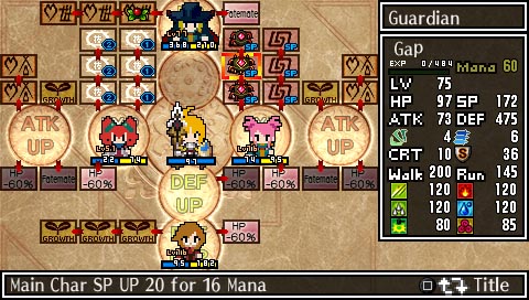Like This is an RPG!, this title’s strategic component centers around the Magic Circle, which serves as a figurative circuit board. Although only one character is seen on-screen during the dungeon delving, the protagonist’s stats are augmented by a selection of concealed teammates. Before plunging into a quest, players manipulate one of x2’s templates- inserting created characters and artifacts in an effort to maximize their speed, defense, hit and spell points. Since each Magic Circle has its own benefits and disadvantages (ranging from attack bonuses to a HP deduction), it’s imperative that players constantly change and tweak the blueprint to persevere in the game’s ever-changing environments. Since teammates gain experience just being in the Circle, successful players should also vary their lead explorer, in an effort to maximize the efficiency of the entire party.