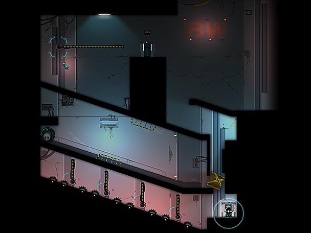 Early on, these fatalities occur infrequently, as players absorb the workings of Constant C’s world. But gradually, the game starts presenting additional mechanical complexities. Switches around the environment rotate room around putting the protagonist or any unfrozen objects into motion. Gates appear, which will only swing open a specific way- often creating additional obstacles for gamers. Later, the title throws even more complexities at players- requiring the robot to shift gravitational directions, mid-fall. Naturally, the game’s puzzles take advantage of these new gameplay elements, obliging players to create enough momentum to send the robot sailing over floors filled with deadly objects.