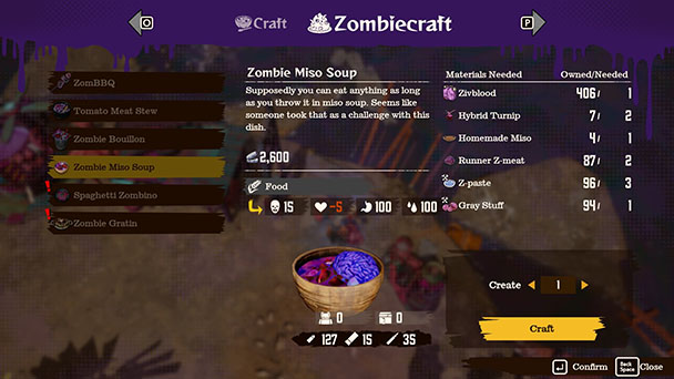 But first, know that Deadcraft isn’t a thoroughly polished title. When locked onto enemies, the overhead perspective spins and jerks about, attempting to framing the action. Balance can be another issue at times. As you strive to make progress by salvaging resources for crafting, its can be frustrating to contend with variables like hunger, thirst, and energy. The latter is especially vexing, habitually requiring long treks back home. As a half-zombie, you’ll struggle with keeping your undead inclinations in check, or else NPCs will open fire on a lurching, inarticulate ghoul. But stick with the game, and acquired skills will remedy some of the frustrations, allowing you to appreciate the game’s gallows humor. Eventually, you can even grow your own zombie army by planting human bodies and Ziv hearts in the soil.