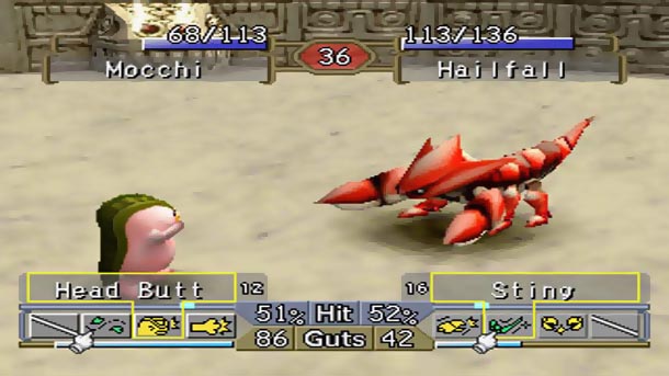 The Guts meter is a bar and number along the bottom of the screen that is the Monster Rancher equivalent of “PP” from Pokemon. Attacks require a certain amount of Guts to be pulled off. This number regenerates pretty rapidly, but that doesn’t mean you should go on the offensive constantly. Sometimes putting distance between your monster and the opponent’s after striking them is the best course of action. Matches only last 60 seconds, less if a monster is knocked out or the white flag is waved. At the end of the 60 seconds (if no KO or surrender happens), the winner is determined by the percentage of health remaining. Whoever has the highest percentage wins.