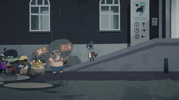 Despite an anthropomorphized cast and stylized backdrops that resemble a Tex Avery cartoon, Fall of Porcupine has a few truthful insights it would like to share. Players assume the role of Finley, a junior doctor at St. Ursula’s Hospital who also happens to be a pigeon. Like many medical dramas, Fall of Porcupine’s world is viewed through the eyes of a newly arrived physician, who not only is still learning about the nuances of his vocation but is also grappling with acclimating to small-town life and is still learning about the idiosyncrasies of his colleagues.