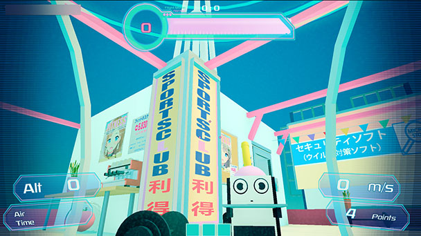 Much like the original Jumping Flash!, Forza Polpo! is set out of gaming’s sunniest dystopias. Humanity might be long gone, but its presence is still felt in the game’s convenience stores, towering waterslides, or the occasional refrain of Japanese city pop playing from a speaker across the game’s selection of sixteen stages. Against a sweeping azure sky, Polpo’s sun-bleached exteriors can verge on the surrealistic, with the occasional life raft or work truck floating about, disregarding gravity.