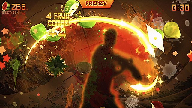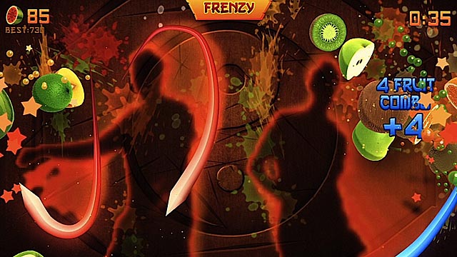Whereas the phone-based app allowed gamers to instinctively swipe at flying fruits, Fruit Ninja Kinect creates a near-negligible ‘dis-Kinect’ as a player’s on-screen silhouette initiates the slicing. Rapid, karate-chop-like movements create visible flashes- which when in the proximity of a fruit, dices the food in half while delivering a satisfying splatter of puree of the backdrop. Although there is the intermittent swing which doesn’t seem to connect with the flying foodstuffs, generally the title is remarkably responsive. Strangely, the game’s menu system is one of the more problematic elements; several times I launched another round instead of backtracking toward the mode selection screen.