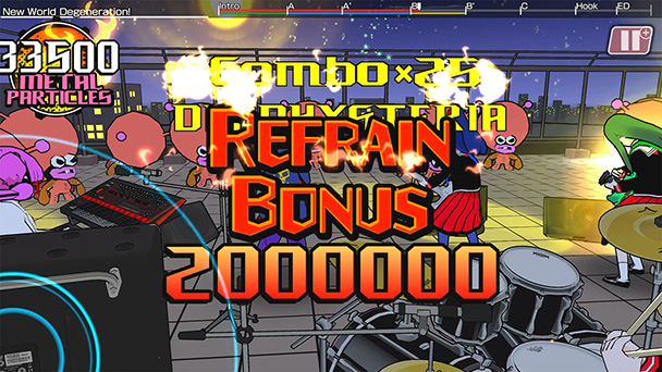 Mercifully, Gal Metal doesn’t require the accuracy of most rhythm games. While the game will teach you over three dozen different beats, it rarely compels you into using specific ones. Instead, play is about real performance, and you’ll earn alien-defeating point values based on playing those rhythms, but without any kind of note highway or direction, you’re given complete independence. As such, accuracy counts, and you’ll earn more points for thumping out a solid rhythm, but variety carries much more weight when it comes to uplifting your score.