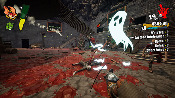 After completing the game’s interactive tutorial, you’ll find yourself in an environment brimming with puntable objects, boxes, barrels, and even chickens—that all can be weaponized. Smartly, GLUM gives you control over the pace of combat. You’re often encouraged to scope out your surroundings and set up opportunities to knock down multiple enemies at once. Aim your kicks just right, and you can send adversaries sailing into spiked coffins or pitchfork-rigged haystacks. These over-the-top finishers not only score you bonus points—they often drop green globules that restore your goblin’s health.