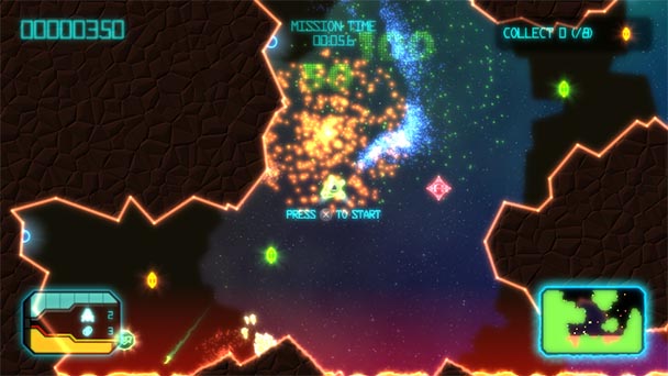 For the uninitiated, Gravity Crash is a multi-directional shooter with lunar gravity with faux-vector-style graphics, similar to Geometry Wars or Super Stardust. Your ship is constantly being pulled toward the ground, but you are able to stay afloat by engaging your thrusters, but abusing your inertia will result in a deadly crash more often than not. Each stage tasks you with collecting a small number of crystals, destroying a number of enemy bases or rescuing stranded spacemen. The control-scheme is just challenging enough that navigating your delicate ship through the craggy depths stays tense as you try to keep your score up and your time down.