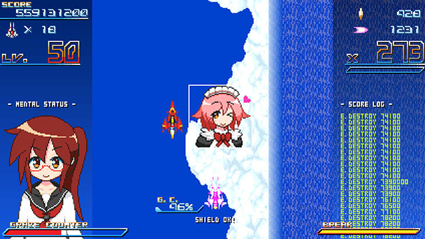 Aesthetically, Graze Counter GM channels the look of the 16-bit era, albeit without the flicker and shortage of sprites. To supplement the space theme, the game’s storyline brings in several pixelated pilots, providing a bit of moe to the proceedings, thanks to a cast of gender-bending personalities. A storyline about escaping from a virtual network has been done before, but GM’s conversations are succinct, with compulsory insults delivered by boss characters. Sonically, the game’s soundtrack extends the type of perpetually upbeat and harmonious melodies that fans of the genre expect.