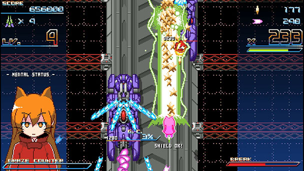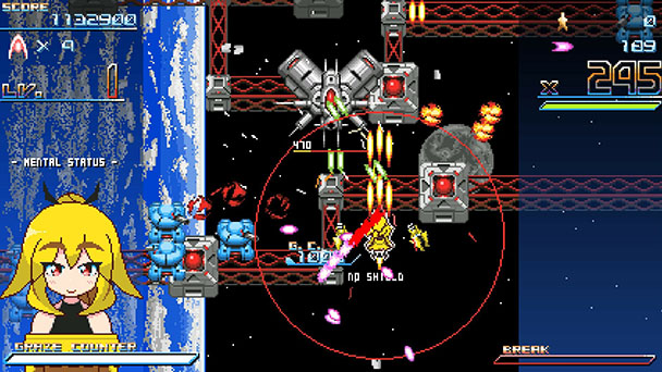 Activating the game’s Graze Counter does more than just augment your arsenal, converting enemy bullets into gold stars. When collected, these icons gradually fill up your Break Gauge. This is linked to an even more devastating attack that fills the screen with your munition and larger stars with lofty point values. While Break Attack is a great last-ditch response, it can also be employed during less hectic moments, where you’ll have the ability to collect all those bigger stars to earn a place on the game’s (woefully offline) leaderboards.