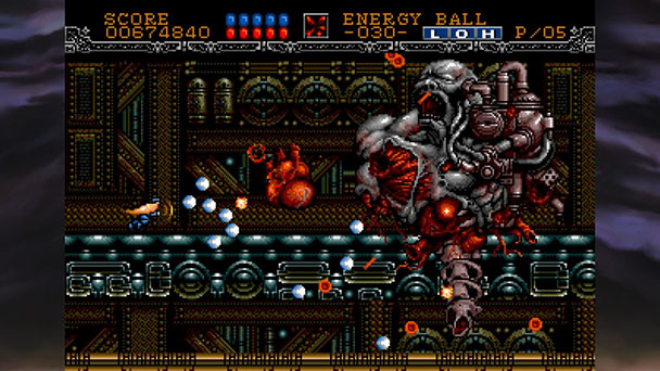 What isn’t expected is the game’s beguiling blend of art styles. Backdrops and playfield borders evoke the steampunk vibe of The Bitmap Brother’s The Chaos Engine (aka Soldiers of Fortune). Subordinate enemies draw from all kinds of games, with everything from innocuous 8-bit era seagulls to cascades of severed arms. And with bosses like the H. R. Giger-esque human/locomotive hybrid, and a biomechanical corpse with pulsating growths and a swinging spine, there’s some fascinating viscera on display. Perhaps the topper is the penultimate boss, who sports what seems to be a giant alien boner.