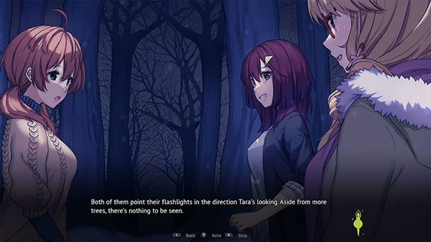 Heart of the Woods is also proficient at establishing its settings. An opening dialog between Maddie and Tara takes place on a night train, and there’s enough attention to environmental detail that it’s easy to image the feel of well-worn seat fabric and the gentle sting of a cheek pressed against the frosty window. Often, visual novels employ meticulously drawn character portraits over processed backdrops. But with Woods, the smoothness of the novel’s character art follows the felty aesthetic of Grant Ferrell and Hui’s detailed locales. Rosuuri’s designs for Tara, Maddie, Morgan, and Abigail are undoubtedly one of the visual novel’s most magnificent virtues. Each is thoroughly exquisite, brought to life with emotive facial expressions and poses. Further success is found in the soundtrack, which does a stunning job at underscoring the sentiment of pivotal scenes.