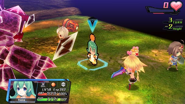 Satisfyingly, Goddess Black Heart does more than just drop names. Stages lampoon elements of the source material, whether it’s a wrestling ring with electrified ropes that satirizes the persistent pugnacity of Street Fighter, a bomb-filled combat zone that’s typifies the tension of Metal Gear Solid, or an exaggerated take on a Winning Eleven football field. Considering that the game’s battles don’t veer too far from strategy role-playing blueprint, the creative contexts can help maintain a player’s interest during the extended duration of the campaign. Ingenuity even extends to the game’s status effects, where characters can become pixelated, tofu-ed, or even zombified, conditions that effect your stats in clever ways.