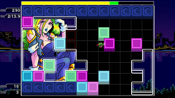 While advancement still requires players to reveal a specific percentage of the playfield, Block Knockers eschews the cutting mechanic of Qix. Take a cue from SEGA’s Pengo, progress is made by sliding giant cubes around. Matching three or more blocks of the same color or smash an enemy with a slab and they’ll expose part of the background image, which are mildly risqué anime-styled drawings. For those with an aversion to nipples or backsides, Block Knockers lets you turn the lewdness down with two types of filters. Unlike Gals Panic, nudity isn’t the only reward, with play that’s proficient enough to stand on its own.