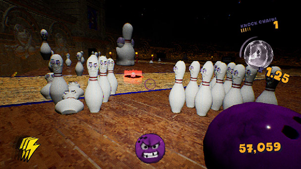 Sparedevil’s training is little more than a diagram detailing the different input buttons. But once you dive into the game’s rounded alley, you’ll realize that bowling is simple. All you have to do is aim your bowling ball toward the groups of pins that are spawning around, charge, and release. Pleasingly, there’s no worry about spin or throwing angle. Instead, you’ll move around “Hell’s Alley”, as you attempt to line up multiple targets.