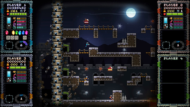 Throughout the trek, there’s a number of satisfying risk/reward proposition. Your default weapon, a throwing ax, has an attack rate that just deliberate enough to keep you moving- ideally toward one of the weapon power-ups which sporadically spawn on-screen. There’s also the option to bring up to three local participants in for co-operative play, with Crypticle ramping up the difficulty appropriately as each new knight joins the fray. Occasionally, putting yourself in peril pay dividends. Pick up a book that pops up and you’ll unlock a bit of helpful information in the game’s ledger, that might offer a hint about things like your dashing or atomic fist abilities.
