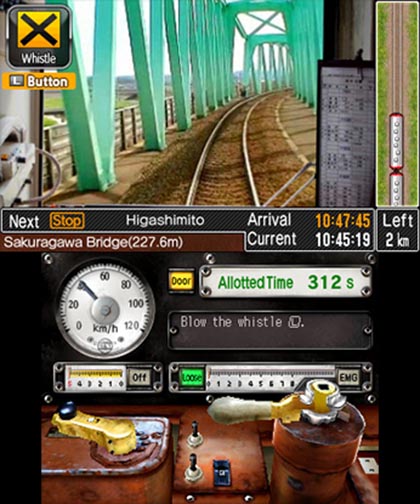 At each station a countdown timer gradually winds down until it’s time for departure and the doors automatically close. Once this happens, players can use the ‘Y’ button to release the brakes, before using the directional pad to increase the speed on the master control switch. Alternatively, players may opt to use the stylus to interaction with the levers that are rendered on the bottom 3DS screen. Regardless of what input method is used, both systems mimic the control system of a Kashima Rinkai Railway KiHa diesel engine.