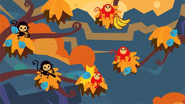 Jungle Rumble’s tutorial does a commendable job at explaining the basics, using a few quick, interactive lessons rather than a longwinded lecture. Set to a persistent 4/4 beat, the game tasks players with issuing commands to a tribe of cordial monkeys. To send a simian to a different tree branch, players tap the primate on the first and third parts of the measure, while on the second and fourth beats, the desired destination is touched. Scattered along the tree line are coconuts, which can be thrown at enemy monkeys to remove them from the forest. To attack an antagonist, players touch their own monkey three times, with a fourth touch flinging a projectile toward a nearby color-coded primate.