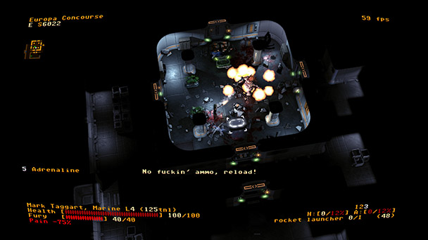Runs begin with the selection from three different character classes that have their own unique resource. Marines begin the game with a small health pack and are especially resilient, with the ability to stack additional health and even recoup a bit when they enter a new level. Their resource is fury, which gradually regenerates with every enemy kill. This can be converted to adrenaline, providing healing and temporary immunity.