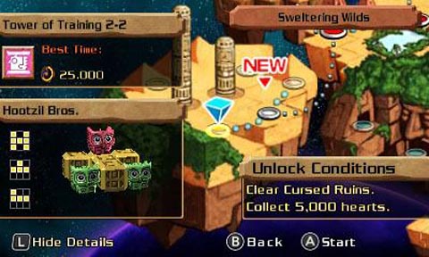 The title’s use of 3D is especially inspired, with each stage shuttling gamers through exteriors with varying exteriors, twisting hallways, and vestibules with shifting obstacles. Gamers who habitually keep the depth slider to a minimum will want to crank the switch here- Ketzal’s Corridors’ sense of perspective stands as a showcase for the portable.