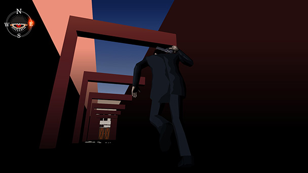 Those expecting straightforward exposition are bound be dumbfounded by Killer7’s methods. Dialog is often deliberately abstract, adding to the feeling that you are an interloper in the game’s curious world. The game’s NPCs are every bit as unusual as its verbiage. Iwazaru, who offers assistance through much of the game, is dressed in bright crimson bondage with his hand permanently fixed into a ‘finger in front of the mouth’ silencing gesture. Typically dangling in environments by a bungee cord, his appearance seems bizarre, but like many of the Killer7’s complexities, gradually comes to make sense.