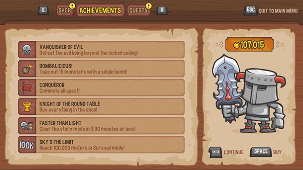 Building on a concept pioneered two years ago, the Steam iteration of Knightmare Tower provides both a campaign and survival mode. While the story mode is not that much different from the madness that survival provides, is does provide a bit of motivation, with the eponymous Knight summoned to rescue a total of 10 princesses, no questions asked. Although the core storyline doesn’t really get developed, exposition can be found in the seventy quests, which must be completed before confronting the game’s final boss. By that time, players will master the game’s main mechanic, which tasks the Knight with slashing through a myriad of monsters as they fly up from a rocket.