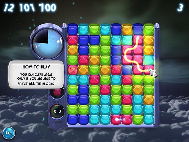 What is the concept? Ever since Bejeweled popularized the match-three puzzler in 2001, players have enduringly eliminated patterns of similar items from their screens. Wisely, Lucid abandons the genre’s conventional control method, where players shift the places of two pieces. Instead, groups of identically-colored blocks are removed when players draw a line through at a group of at least two identically-hued blocks. To prohibit the title from becoming too simplistic, the game has two additional regulations: drawn lines cannot double back on themselves and are required to touch every member of a specifically-colored cluster. As such, Lucid works on two levels- as players struggle to lasso complex shapes while simultaneous influencing the arrangement of the playfield.