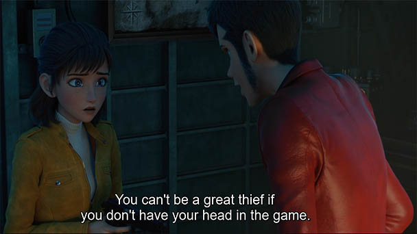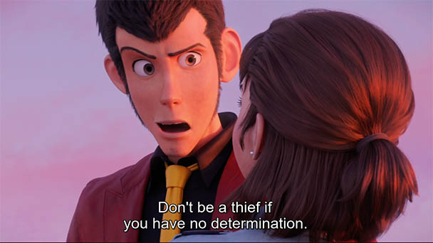 Both audiences will undoubtedly appreciate The First’s direction, which heeds attention to setting. The film’s early minutes is played out on Parisian rooftops (with assistance from French animators). Here, Yamazaki doesn’t neglect the dizzying heights as Lupin and Laetitia scamper across the skyline. Seizing the advantage afforded by computer generated imagery, sequences often include high-perspective shots, providing context for the action. One sequence transitions from a aircraft resting on a barren desert to the entrance of a mountain cave, showcasing the kind of fluidity CG is adept at.