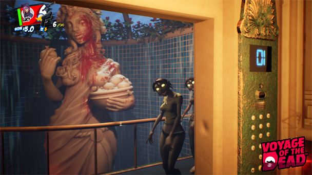 As such, I approached the third game in the MARS launch lineup guardedly. After all, here was a title I was most eager for, a game that mirrored the first-person on-rails blast fests of series like House of the Dead. Built on the fourth iteration of the Unreal Engine, Voyage of the Dead’s certainly outshines Big Buck Hunter’s and Qubit’s visual appeal. Stranded on a resort cruise when disease breaks out, up to four players work together to head-shot the rambling dead while protecting any survivors.