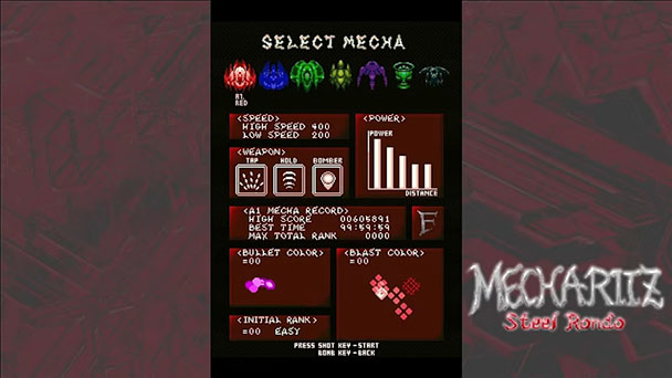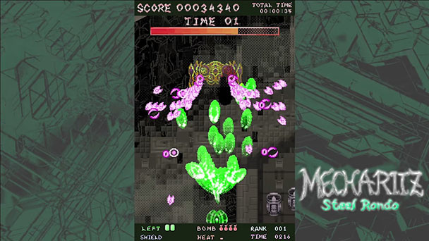 Although the game provides a 42-page in-game manual that explains many of the fundamentals, Mecha Ritz is a bit cagey on how variables like Heat and Rank function. Essentially, the former represents your attack power and fills between one to five on-screen bars. The latter is a numerical measure of attack intensity, affecting things like the scrolling speed of the game to how far enemy projectiles travel before they fizzle out. As such, expect to face powered-up foes that might emit an explosion of munitions when they are destroyed if you’re doing well.