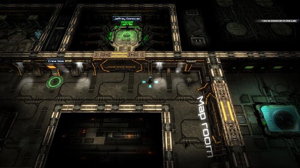 Gamers assume the role of Commander Daniel Hanson, a charismatic leader with a brief backstory found in New World’s encyclopedia component. Shirking both the full-motion video cutscenes or pared down dialog of most RTS titles, Meridian adopts a role-playing-like system to deliver expositional elements. As players relocate around their colonial ship, they have the ability to speak with their comrades through branching dialog trees. Not only do verbal choices have an impact on the trajectory of New World’s narrative, but being able to select dialog responses enables player identification with the protagonist more than pre-determined conversation could.