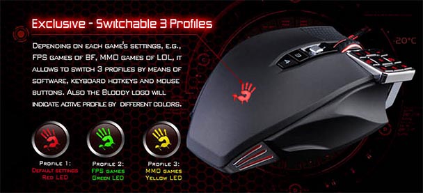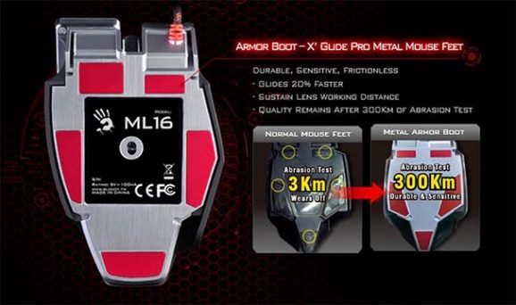 Consistent with the levels of excellence pursued by Bloody, the body construction of the ML16 is solid and durable without being heavy or clunky. As with other models, the mouse boasts metal x’glide feet, which provide a notable increase in ease of movement. The ML16 glides effortlessly across a variety of surfaces, and the optical cavity is protected and dust-resistant. The Bloody mouse has advanced laser technology, which allows for uninterrupted cursor sensitivity. The ML16 boasts 16-grade calibration, making mouse movement and sensitivity easy to customize for each individual user. The ML16 also has the same braided cord as on previous models and it is long enough to keep those used to a wireless mouse from feeling like they’re on a tether. The cord is also durable enough to match the mouse’s “20 million click” guarantee on the left click button. The durability continues into the body of the mouse, as the x’glide feet promise over 300km of usage without wear. Other noteworthy features include a sweat-proof textured panel on the left button, contoured sides, and 17 easily-accessed and programmable buttons.
