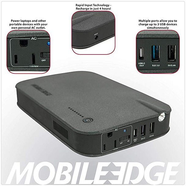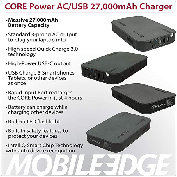 With the Mobile Edge 27,000 mAh Core AC Power Charger in your bag, there’s always an AC outlet at the ready. For those with power needs less than 85 watts, that can be incredibly handy.