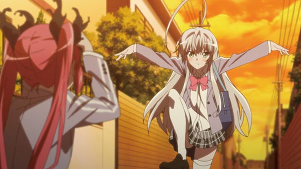 The first season’s other virtues can be found in its quirky characterizations. Nyaruko offers a pleasing blend of eccentricity, visceral fighting ability, and lasciviousness, whether she’s making mouthwatering bentos from indistinct ingredients, changing forms or calling out quizzical attacks, or perpetually trying to seduce Mahiro. Her once-nemesis Kuko (born of a rival Cthughan blood) joins the cast in the second episode, adding a bit of rivalry as well as yuri tension/fanservice.