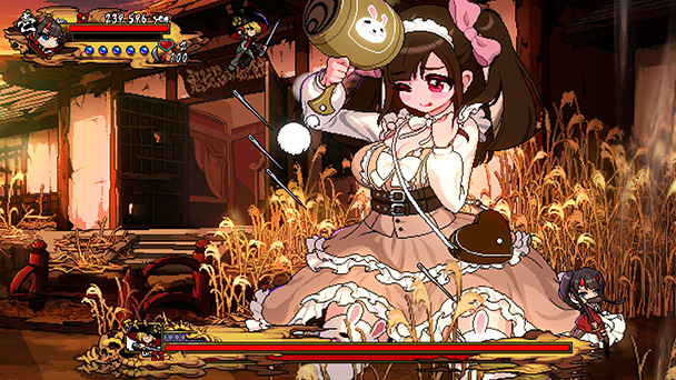 Given a choice of three different protagonists, I began the game with Yume. While her loligoth dress and naïve manner might seem to signal that’s she a pushover, Yume is exceedingly ferocious. Sure, she might drag her weighty spiked club when she’s walking across two-dimensional playfields. But when she swings her weapon of choice, Yume dispenses a multi-hit combo that rivals the best action-game heroes. Likewise, sisters Ran and Hana are just a fierce with their sword and whip.