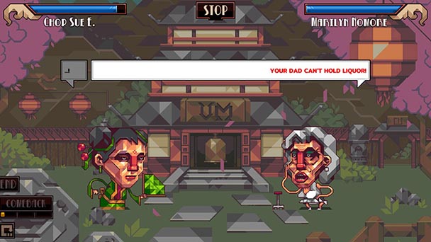 After selecting from one of five different avatars, as well as a venue for your contest, both opponents begin the bout with two full health bars. Utilizing a turn-based approach, you and your rival select phrases from a bank in the middle of the screen. Essentially, you’ll be constructing an insult from these words, with lapses any lapses in grammar or incomplete sentences penalizing the player.