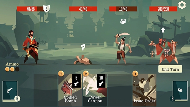Like any respectable single-player card game, Pirates Outlaws begins with an interactive tutorial that explains nearly all the essentials. A match kicks off with players selecting a character from the game’s cast of fourteen seafarers, each having their own stats and distinct abilities. But you’ll start with the gunner, who’s distinction is regenerative ammo. Earn enough repute from games and you’ll be able to unlock characters with a larger health supply or ones that randomly either double or halve damage. Each buccaneer has their own unique starting deck as well.