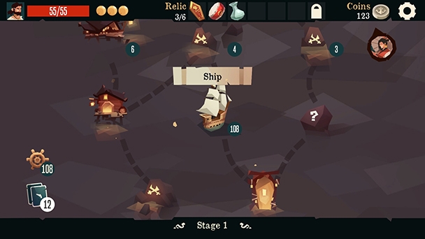 Initially, you’ll only be able to tackle the Navigate campaigns, where six separate missions send you sailing between islands as you approach a stage boss. At the start of each game you’re given an allotment of 100 points. Traveling to each isle consumes these points, which can be replenished at taverns and marketplaces. Run out of points and there’s an escalating chance of shipwreck each turn. But even with Lady Luck’s generosity, the game will end on the fourth turn. As such, you’ll probably want to squirrel away few coins before this mishap occurs. But like any engaging card game, circumstances will force you to dip into your savings.