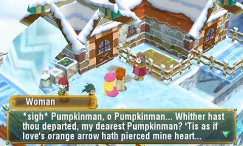 Visually, Return to PoPoLoCrois makes the most of the 3DS stereoscopic capabilities, offering interiors and landscapes that flaunt multiple levels of depth. While some characters vaguely look like Nintendo Miis, they display a pleasing range of emotion and animate fluidly. Periodically, players are even treated to a fully animated cutscene, but unfortunately, these interludes seem all too brief. Sonically, the game provides both English and Japanese voiceovers, although gamers wont get to hear every line vocalized with some dialog summarized by one word spoken responses. Unlike the typical sterile synthesized MIDI scores that accompany many portable RPGs, PoPoLoCrois’ soundtrack feel organic, with instrumentation that can sound like a like performance.