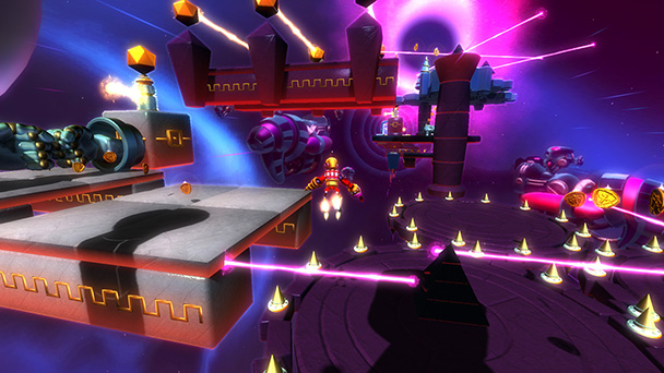 With the ability to roll, jump, double jump, the game’s protagonist has a repertoire built on navigational tradition. But the developer added a few more abilities to make the trek through each meandering stage a bit easier. Hold down a shoulder button and the robotic hero will crouch, charging for a powerful leap that can catapult him skyward. Most beneficial is his ability to cling to the side of structures. Not only can you scale-jump the side of tall structures, but you can also glide down.