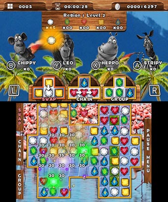 Beyond this trifecta of tile eliminating approaches, Safari Quest also gives gamers additional assistance. By allowing different animal icons to hit the bottom of the playfield, players earn power-ups that are activated with a press of one of the 3DS’ four face buttons. Capable of changing a specific tile, removing grass from grid squares, or producing icon-clearing explosion, these elements will undoubtedly help gamers deal with the scourge of rocks and other immovable elements that litter the playfield.
