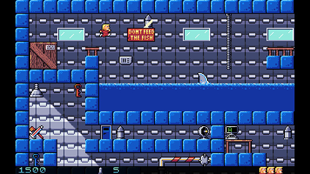 Although the first few bi-directionally scrolling stages are fairly straightforward, Secret Agent HD becomes increasingly complicated. It’s possible to use keys in the wrong order, entrapping Agent 006 in a level. Given the game’s age, the presence of backtracking shouldn’t be too much of a surprise. While the protagonist can withstand three hits from most dangers, the fourth will reset the entire stage. Pleasingly, collectables are scattered generously, offering score-boosting possibilities. There’s also a number of power-ups that do thinks like extra ammunition or uncover invisible stairs. But beware there are a couple of undesirable pick-ups as well, which will slow 006 down or reverse the controls.
