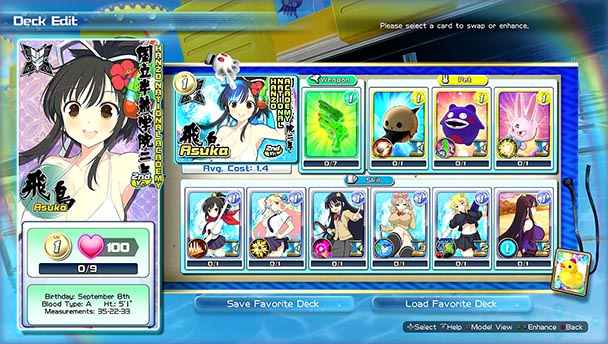 Delve into Peach Beach Splash’s single player components and you’ll find a variety of modes that rival Estival Versus’ cornucopia of content. Story mode splits the exposition between the Gessen, Hanzo, Hebijo, and Crimson Squad academies, with each arc extending ten missions that gradually reveal the impetus for the game’s tournament. Paradise Episodes extends twelve Shinobi Girl’s Heart-style side quests, with the multipart missions focusing on character development, relationships, and rivalries. Finally, there’s the V-Road challenges, which offers a procession of team-based matches, and are one of the quickest ways to earn coin and card, Peach Beach Splash’s two currencies.