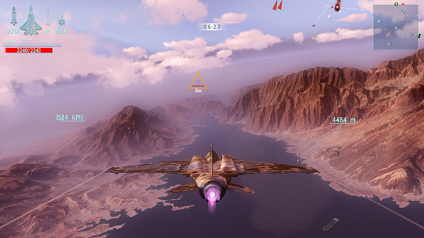 Thrown into the fray against multiple bandits, you’re not told how to switch between your main weapon types. On-screen button assignments show an assortment of tools and your disposal. But you’ll have to experiment to learn how and when to deploy enemy missile misleading flares. Worse, you’ll never see your aircraft go up in flames when your jet’s damage gauge is completely depleted. Instead, you’ll instantly sent into a crimson colored ‘game over’ screen wondering what killed you. Likewise, don’t expect much comradery with your wingmen after a successful sortie. Here, Afterburner jumps right into the payoff screen doling out currency you can use to purchase new planes and weapons. Largely, plot takes a backseat to play.