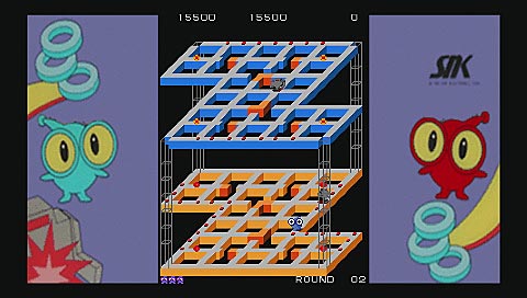 Although names like Vanguard and Ikari Warriors might be recognizable to those well-versed in the history of gaming, this batch also has its share of obscure titles such as Sasuke Vs. Commander. Fortunately, familiarity isn’t a requisite for this collection, as many of the titles recall or even replicate famous games. Hal 21, so closely apes Xevious‘ mechanics and look, that its surprisingly Namco’s attorneys have never sent a missive to SNK. Although Marvin’s Maze doesn’t completely mimic Crystal Castles’, the geometrically-based dot collecting is undeniably similar. Even Ozma Wars’ sound effects divulge the game’s Space Invaders origins, even if the title’s falling foes evoke more of a Galaga vibe.